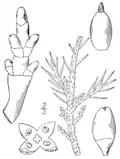 Arceuthobium pusillum or dwarf mistletoe parasitizes the branches of spruce, pine, and tamarack trees and is one of many causes for the deformations known as "witches brooms" seen on those trees.