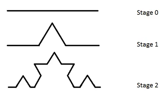 In 1904, Helge von Koch discovered the von Koch snowflake curve, "a continuous curve important in the study of fractal geometry" (3). The Koch curve starts with a single line segment that is 1 unit long. Then, the segment is replaced with four new segments, each one-third the length of the original, also called the generator. The process is repeated forever and creates the Koch curve. The image below shows this process for stages 0 to 2.