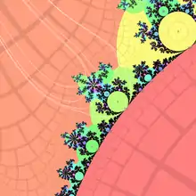 • the biggest baby Mandelbrot set has the kneading sequence AAAAAAAAAAAAAAAAAAAAAAAAAAAAAAB* corresponds to the internal address 1-31-32 . The period is 32. The smallest angles are 3/4294967295 = 0.(00000000000000000000000000000011) and 4/4294967295 = 0.(00000000000000000000000000000100)