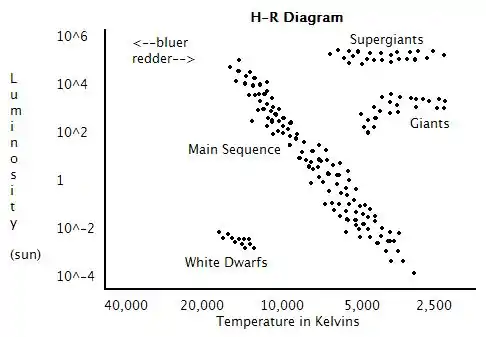 Stars which lie along the top right of the diagram are luminous and cool and are known as supergiants. Fainter, hotter stars - which appear at the bottom left of the diagram - are known as white dwarfs. Hot and bright stars are located at the top left of the diagram, and cool, dim stars at the bottom right.