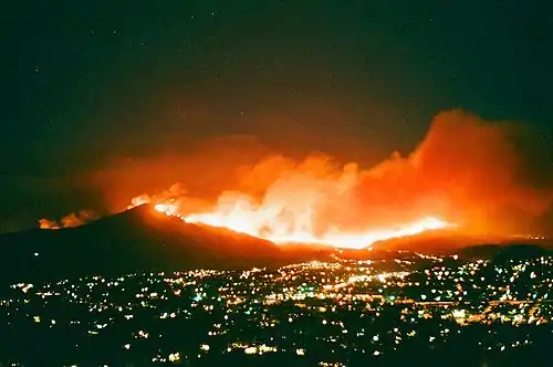 The Santa Ana winds often arrive at the end of California's long summer drought season. The hot dry winds dry out the landscape even more. If a fire starts, it can spread quickly, causing large-scale devastation. In late October 2007, Santa Ana winds fueled many fires that together burned 426,000 acres of wild land and more than 1500 homes (Figure 15.24). The 2003 Santa Ana winds contributed to the loss of 721,791 acres to wild fires.
