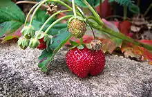 Strawberries are ripe when fully red. They should be picked often, as the fruit quickly rots after ripening, and is highly susceptible to gray mold which can spread to other fruits or to the foliage.