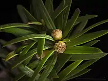 They have reddish bark, lanceolate, flat, dark-green leaves 1-4 cm long and 2-3 mm broad, arranged spirally on the stem, but with the leaf bases twisted to align the leaves in two flat rows either side of the stem.