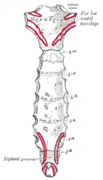 The xiphoid process attaches to the sternum via the xiphisternal joint. It is the smallest part of the sternum and can vary in shape and size depending on the individual. Because it is so small, it is fragile and can easily be broke during chest compressions if they are not done correctly. In most people, the xiphoid process remains cartilaginous until the middle ages. It serves as a point of insertion for abdominal muscles and ligaments.