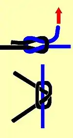 The square knot aka reef knot is a common and simple binding knot.