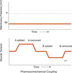The following illustration demonstrates the effect on two agents, A & B on Muscle Tension in pharmacomechanical coupling. Note that there is no change in the membrane potential.