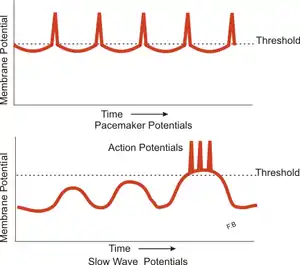 Some pace maker cells will trigger an action potential with every slow wave, others with only occasional slow waves. The following illustration shows the electrical pattern of slow waves with occasional action potentials and 'pacemaker' potentials where every wave generates action potentials. Each slow cycle lasts 7–12 seconds.