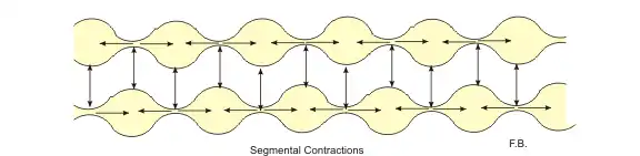 Segmental contractions are used for mixing food or chyme. The circular muscles in adjacent segments of the intestine undergo alternate contraction and relaxation. The effect of this is not to move food along the lumen, but to churn it and mix it, especially with the digestive juices. Segmental contractions also bring the chyme into contact with the epithelial cells for absorption.