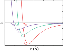 In the case of two separate molecules interacting, a combination rule called the Lorentz-Berthelot combination rule can be imposed to create new σ and ε values. These values are arithmetic and geometric means respectively. For example, an Ar-Xe L-J plot will have intermediate σ and ε values between Ar-Ar and Xe-Xe. An example of this combination rule can be seen in the figure to the right.