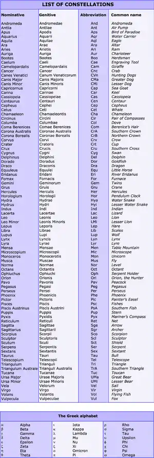 The most used designation for the brightest stars is the Bayer designation. Stars designed with this system show a Greek letter, followed by the genitive form of its parent constellation's Latin name. After the letter “omega”, lower-case Latin letters are used, and then, upper case Latin letters.