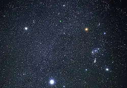 Examples of reflection nebulae are Messier 78 in Orion, and the small nebulous patches surrounding the stars of the Pleiades cluster.