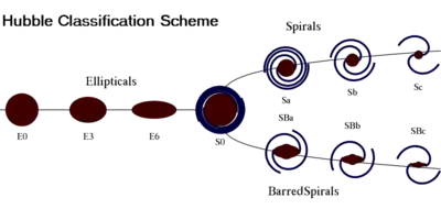 Galaxies come in three main types: ellipticals, spirals, and irregulars. A slightly more extensive description of galaxy types based on their appearance is given by the Hubble sequence. Since the Hubble sequence is entirely based upon visual morphological type, it may miss certain important characteristics of galaxies such as star formation rate (in starburst galaxies) and activity in the core (in active galaxies).