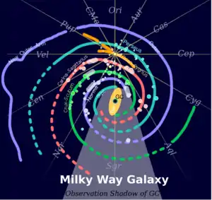 The Milky Way consists of a bar-shaped core region surrounded by a disk of gas, dust and stars forming four distinct arm structures spiralling outward in a logarithmic spiral shape. The mass distribution within the galaxy closely resembles the SBbc Hubble classification, which is a barred spiral galaxy with relatively loosely wound arms.