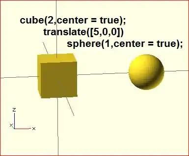 color("blue") { translate([5,3,0]) sphere(5); rotate([45,0,45]) { cylinder(10); cube([5,6,7]); } }