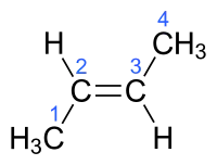 There are two forms of these isomers; the cis and trans versions. The form in which the substituent hydrogen atoms are on the same side of the bond that doesn't allow rotation is called cis; the form in which the hydrogens are on opposite sides of the bond is called trans. An example of a small hydrocarbon displaying cis-trans isomerism is 2-butene.