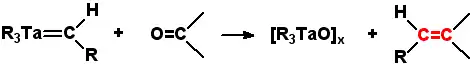 It occurs via the carbene species nowaday known as Schrock's carbenes