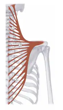 | Serratus anterior | Ribs 1-9 | Scapula | Draw scapula laterally forward (protraction); respiration | Long thoracic nerve (C5-C7) | ![]() Serratus anterior |