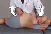 | Internal rotation | Flex the hip and flex the knee while internally rotating the hip to its barrier | ![]() Spencer's technique of the hip - internal rotation |