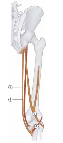 Tibial nerve (L5-S2) | ![]() Hamstrings: 1 - Biceps femoris, 2 - Semimembranosus, 3 - Semitendinosus |
