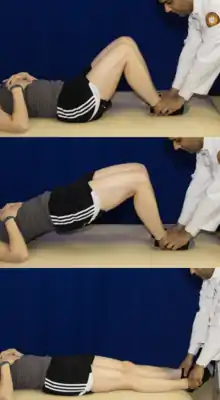 | Reciprocal inhibition muscle energy of a hypertonic psoas muscle | The patient lies supine at the end of the table with the dysfunctional lower extremity hanging off the table. The non-dysfunctional hip is flexed by bringing the hip to the chest to flatten the lumbar lordosis. The physician positions the patient's thigh toward the floor extending the hip into the restrictive barrier. The physician instructs the patient to push down toward the floor while the physician resists. The physician brings the patient further into the barrier. | ![]() Psoas RI ME |