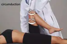 | Circumduction with traction | Extension of the knee; grasp the foot and ankle with traction and rotate the hip through increasingly large circles in both clockwise and counterclockwise fashion | ![]() Spencer's technique of the hip - circumduction with traction |