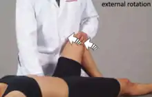 | External rotation | Flex the hip and flex the knee while externally rotating the hip to its barrier | ![]() Spencer's technique of the hip - external rotation |