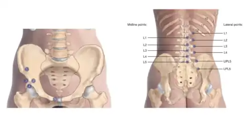 | PL1-PL5 | Inferolateral aspect of spinous process or laterally on transverse process of dysfunctional segment | Patient prone with hip E SARA |