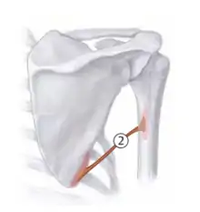 | Teres major | Inferior angle of scapula | Lesser tuberosity of humerus | Internal rotation, adduction | Subscapular nerve (C5-C6) | ![]() 2 - teres major |