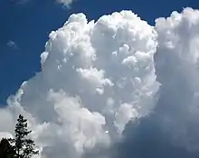 These clouds are towering giant clouds associated with thunderstorms. Climbing upward into the atmosphere more than 12 kilometers, these clouds can release huge amounts of rain, snow, hail, and are associated with lighting and thunder and even tornadoes. Near the top they will sometimes form anvil heads. Near the base they will form a grayish or bluish color, because of the super saturation of water vapor. Often rain or snow will fall beneath a cumulonimbus cloud. Evening summer thunderstorms are often a result of cumulonimbus clouds.