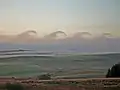 A number of strange cloud formations have been given names and described. The most iconic is likely the Lenticularis clouds, which resemble gigantic circular UFOs. They are a type of altocumulus cloud which are carved by wind into oval-like shapes high in the sky. Virga clouds are thin wispy clouds that drape down from rain clouds. Virga are caused by precipitation that falls from the underside of a cloud, often the moisture evaporates before it reaches the ground, although it can cause a light shower of rain or snow directly below its veil. Mackerel Sky is a sailor term for a sky filled with rows of small cirrocumulus or altocumulus clouds displaying a speckled pattern of clouds that look slightly like the scales of mackerel fish, caused by high altitude atmospheric winds. Mackerel Skies are often used by sailors to forecast rain, since they occur as barometric pressures fall, indicating a low-pressure system is developing. Nacreous clouds are only found in Artic regions, and are high iridescent-colored clouds that form near the top of the Troposphere when the atmospheric is extremely cold. They are most often observed in cold and dry polar regions, and are formed from ice crystals high in the atmosphere. They are often referred to as polar stratospheric clouds, and are sought after by cloud watchers. Noctilucent clouds are scientifically interesting rare clouds that are found within the Mesosphere, at very high altitudes above Earth. They are often observed following a major volcanic eruption, and are thought to be caused by volcanic dust and water vapor that is injected into the high Mesosphere where they form wispy thin clouds best seen near sunset or sunrise. They have been observed after rocket launches, when particulates and water vapor are carried high into the atmosphere from the rockets as they combusted fuel during lift off. Mammatus clouds are pillow-like clouds that can form below cumulonimbus clouds, the term comes from the Latin word for breast or utter, mamma. Kelvin–Helmholtz clouds are caused by velocity differences between two layers of the atmosphere, which results in wave-like clouds that resemble crashing ocean waves. They are named after English physicist Lord Kelvin and German physicist Hermann von Helmholtz who both described the physics of these wave formations in the 1860s and 1870s. Arcus clouds are a rare storm clouds that rolls across the sky. They are associated with cold fronts and thunderstorms, which cause the clouds to appear to roll over the landscape. They are known by other names, including Roll clouds, Shelf clouds, or Volutus clouds. Arcus clouds are related to the phenomena of rolling giant dust clouds called haboob, which comes from the Arabic term for blasting or drifting. Haboobs form where strong gushes of wind blow across an arid landscape lifting dust and particles into the air. They proceed thunderstorms and advancing lower pressure fronts, which bring strong winds. Haboobs can cause respiratory problems since these airborne dust particles can be breathed in by people trapped in these storms. Sun dogs, or parhelion are strange and rare atmospheric events that cause the sun to appear to have two bright spots that flank the sun on either side. These sun dogs are caused by ice crystals within cirrus or cirrostratus clouds reflecting a large halo around the sun around 22 degrees to either side. These Sun dogs can be particularly bright when the sky contains thin cirrus clouds which reflect the sunlight passing through them.