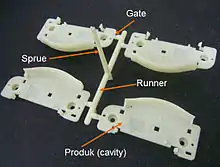 - primary runner and secondary runners (branches starting from the sprue and then by the primary runner, for multi-cavity moulds or multiple injection points)