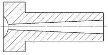 The sprue channel is originated by a sprue bushing that conveys in the channel the plastic flow coming from the nozzle of the press. The sealing of the channel with the nozzle is obtained by contact only, by the force applied from the machine to the cylinder. The following relations are generally respected in order to correctly seal the contact and guarantee easy demolding and no freezing of the zone before the completion of the complete part[1]: