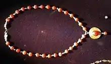 The top necklace on the right is from between the 1st century B.C.E. to the 1st century C.E. It is made of carnelian and gold. The carnelian