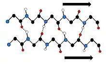 The parallel arrangement occurs when neighboring polypeptide chains run in the same direction, meaning the N and C terminals of the peptide chains align. As a result, an amino acid cannot bond directly to the complementary amino acid in an adjacent chain as in the anti-parallel configuration. Instead, the amino group from one chain is bonded to a carbonyl group on the adjacent chain. The carbonyl group from the initial chain then hydrogen bonds to an amino group two residues ahead on the adjacent chain. The distortion of the hydrogen bonds in the parallel configuration affects the strength of the hydrogen bond because hydrogen bonds are strongest when they are planar. Therefore, due to this distortion of hydrogen bonds, parallel beta sheets are not as stable as anti-parallel beta sheet (exp: formation of parallel beta sheet with less than 5 residues is very uncommon).