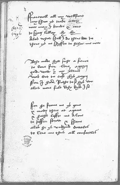H2 paid particular attention to the presentation of this poem: it begins on the verso of f.9 and continues on the recto of f.10 (facing pages). The stanzas are evenly spaced for the maximum visual effect of balance. "Farewell all my wellfare" is one of seventeen entries in which Margaret Douglas marks: “and thys.” Paul Remley suggests that these annotations relate to another in-text annotation of hers, “lerne but to syng it” (81r), and may indicate a group of texts to be learned for entertaining.[4]