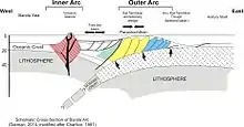 Plate tectonics theory which predict the presence of an accretionary wedge, composed of distal sediments scraped from the ocean floor at the inner side of the arc. At this place, however, de Smet (1999) found continental basement rocks and Early Mesozoic continental sediments. The situation is explained as the result of an inversion process of the Australian continental margin during the Neogene plate collision between Australia and the Banda subduction zone. De Smet (1999) concludes that the Outer Banda Arc is not an accretionary complex, but instead the compressed northern rim of the Australian continent. The load of Australian continental margin sediments that accumulated during the Mesozoic and Tertiary is pushed up on the back of crustal blocks of continental basement to form the present islands and mountains of the Outer Banda Arc.