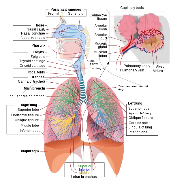 Nose - Main gateway of the respiratory system. Oral Cavity - Second main gateway of the respiratory system. Pharynx - Carries air to the lungs. Trachea - Main part of the body air way, providing air flow to and from the lungs. Lungs - Allows oxygen in the air to be taken into the body.