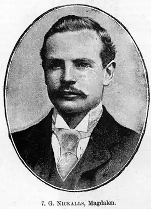 In the University Fours in November, 1888, Third Trinity was drawn with Emmanuel. Both crews had done fast times in practice, and in the race they were level at Ditton. Here, rounding the corner, the Third Trinity boat gave a lurch, and Muttlebury, who rowed three and steered, found to his consternation that his sliding seat was jammed and was absolutely immovable. Quick as thought he tucked the loom of his oar under his left arm, turned half round, and after two attempts wrenched the seat off the slides and threw it overboard. The other three oars, not knowing exactly what was wrong, continued to paddle on briskly. “Muttle,” now seated low down on the slideway, started to row again, but at the second stroke, owing to the strain caused when he pulled out the seat, the steering lacing gave way at his foot. Calling out “Paddle on, you chaps,” he calmly stopped rowing, leant forward, and carefully secured the steering lace. Then, after dipping his right hand in the water overside, he cried out, “Now come on,” and, to the encouraging sound of great cheering from the banks, started to pick up the stroke, Bevan, who rowed stroke, having to keep time as best he could by watching three’s blade out of the corner of his eye.