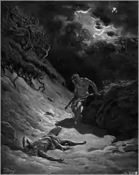 Eve bore Cain and Abel, who became a farmer and a shepherd respectively. Cain brought God an offering from the fruit of the soil, and Abel brought the choicest of the firstlings of his flock. God paid heed to Abel and his offering, but not to Cain and his, distressing Cain. God asked Cain why he was distressed, because he had free will, and if he acted righteously, he would be happy, but if he didn't, sin crouched at the door. Cain spoke to Abel, and when they were in the field, Cain killed Abel. When God asked Cain where his brother was, Cain replied that he did not know, asking if he was his brother’s keeper. God asked Cain what he had done, as his brother’s blood cried out to God from the ground. God cursed Cain to fail at farming and to become a ceaseless wanderer. Cain complained to God that his punishment was too great to bear, as anyone who met him might kill him. So God put a mark on Cain and promised to take sevenfold vengeance on anyone who would kill him. Cain left God’s presence and settled in the land of Nod, east of Eden.