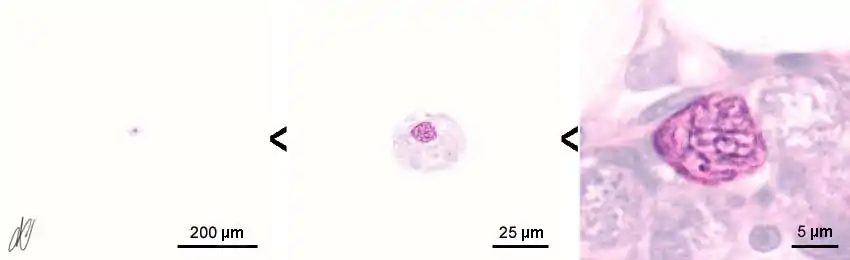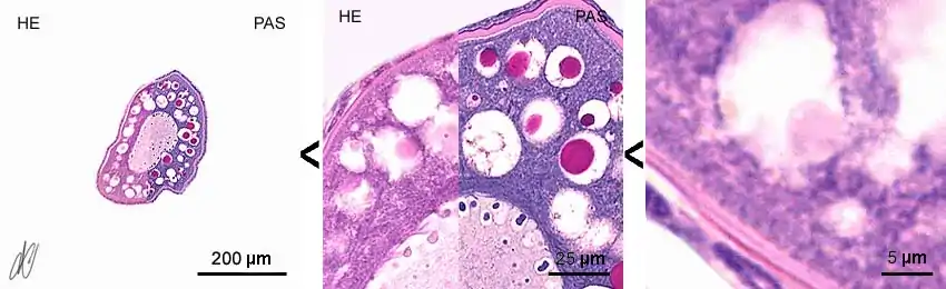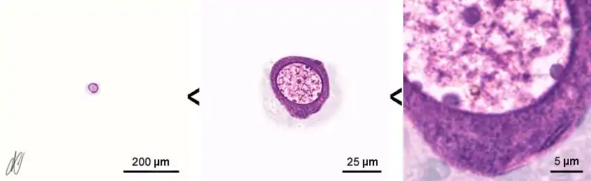 Various systems have been proposed to stage oocyte growth. Such classifications take into account morphological features of the growing oocyte and its nucleus, oocyte size, and granulosa cell layer properties. The staging presented here is mainly descriptive, and is based on Lambert 1970 and Selman 1993. Classical staging terminology is given for comparison. references