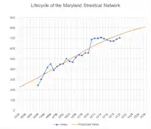 Historical financial and company data from the McGraw Electric Railway Manual – the red book of American Street Railway Investments was used to develop the lifecycle of the streetcar network in Maryland between 1894 and 1920. Data on the “miles of track” was published in this document for the streetcar systems in each city in the USA, which have been extracted to develop a lifecycle model (see Table 1). This data was also compared against the predictive model using the equation provided above. Table 1: Miles of track within the Maryland Streetcar network; actual and predicted