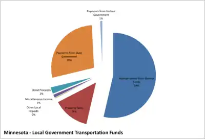 The state of Minnesota spent $2.36 billion on highways in 2008. The largest source of these revenues (42 percent) was state-level highway user taxes. As described in the previous section, the HUTDF collects revenues at the state level from a set of three taxes on motor fuel, vehicle sales and vehicle registration. By constitutional provision, 62 percent of these revenues are directed to state highway construction and maintenance, with the remainder distributed as aid to counties and cities. The second largest source of state government transportation funds, accounting for about one-third of all funds is federal highway aid. These revenues are collected from federal excise taxes on gasoline and other motor fuels, then distributed back to the states by formula. The third largest source of state funds falls under the category "Other Imposts and General Funds", accounting for about 12 percent of revenues. In the case of Minnesota, this relates to other state-level charges that are not listed under the heading of state highway user taxes. The State of Minnesota did not appropriate any general funds for transportation in 2008. Local government payments also accounted for a small share of revenues. These revenues are due to a cost participation policy followed by the state's department of transportation in which local governments are asked to contribute toward the cost of some cooperative construction projects engaged in by state and local units of government, and where some mutual benefit is recognized between both parties. An example might be a project that provided access to an interstate highway in a newly-urbanizing location.