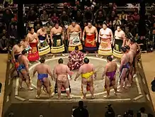 Sumo wrestlers form around the referee during the ring-entering ceremony