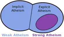 Weak atheists (blue) are divided into implicit atheist and explicit atheists. Some explicit atheists are strong atheists (purple).