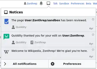 Notifications will inform users about new activity that affects them on this wiki in a unified way: for example, this new tool will let you know when you have new talk page messages, edit reverts, mentions or links -- and is designed to augment (rather than replace) the watchlist. The Wikimedia Foundation's editor engagement team developed this tool (code-named 'Echo') earlier this year, to help users contribute more productively to MediaWiki projects.