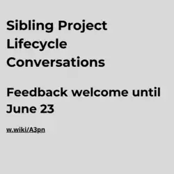 The Community Affairs Committee (CAC) of the Wikimedia Foundation Board of Trustees invites you to give feedback on a draft Procedure for Sibling Project Lifecycle. This draft Procedure outlines proposed steps and requirements for opening and closing Wikimedia Sibling Projects, and aims to ensure any newly approved projects are set up for success. This is separate from the procedures for opening or closing language versions of projects, which is handled by the Language Committee or closing projects policy.