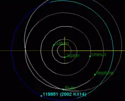 2002 KX14 is a trans-Neptunian object (TNO) orbiting the Sun beyond Neptune at a semi-major axis or average orbital distance of 38.8 astronomical units (AU).[5][a] Its orbit is nearly circular with a low orbital eccentricity of 0.04.[5][4] In its 241-year-long orbit, 2002 KX14 comes within 37.1 AU from the Sun at perihelion and up to 40.5 AU at aphelion.[5] It has a low orbital inclination of 0.4° with respect to the ecliptic, closely aligned with the orbits of the Solar System's planets.[5] 2002 KX14 last passed perihelion in July 1840 and will make its next perihelion passage in May 2085.[18][6]