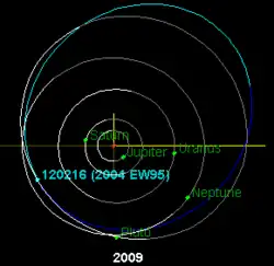 It comes within 9 AU (1.3 billion km) of Uranus and stays more than 21 AU from Neptune over a 14,000 year period.[4] 2004 EW95 has been observed 158 times with an observation arc of 13 years and has an orbit quality of 2.[1]