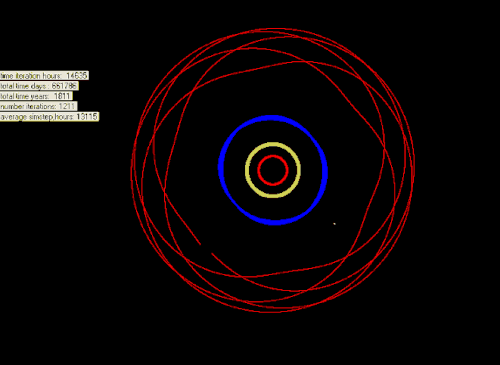 The libration of 2001 KU76's nominal orbit. Neptune is the white (stationary) dot at 5 o'clock. Uranus is blue, Saturn yellow, and Jupiter red.