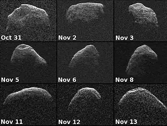It was studied by the 70-meter (230 ft) Goldstone Deep Space Network antenna as it came near Earth, which resulted in radar images and other data about the asteroid, such as its very long rotation period of approximately 100 hours.[9]
